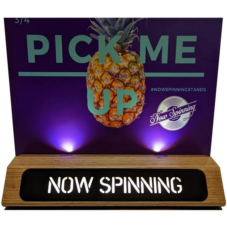 This LED sign display stand is made of wood and PVC with LED lighting. There are two LED lights on the base to highlight the PVC graphic. Besides, you can change the letters in front, which are also backlit. The PVC graphic is interchangeable, so the packing size is small.